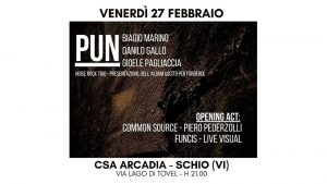 Sul palco PUN, progetto jazz-rock contemporaneo che fonde l’energia del rock con la complessità armonica e ritmica del jazz, tra improvvisazione, dinamiche prog e incursioni elettroniche. Il trio è composto da Biagio Marino alla chitarra, farfisa e apparecchi, Danilo Gallo al basso, stilofono e apparecchi e Gioele Pagliaccia a batteria e percussioni, per un live intenso e in costante movimento.