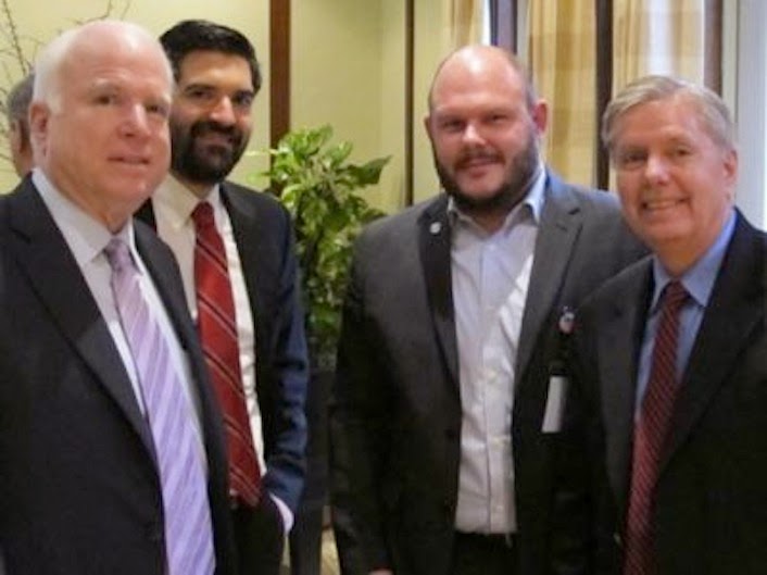 La Libia cadde come era accaduto prima alla Tunisia e all’Egitto, ma il regime di Bashar al Assad restò al suo posto. Ed ecco riapparire McCain. Era il 27 maggio 2013. Il giorno delle foto incriminanti. Il senatore dell’Arizona si recò illegalmente vicino a Idleb, in Siria, attraverso la Turchia, per incontrare alcuni leader della «opposizione armata». Il suo viaggio non fu reso pubblico che al suo ritorno a Washington dal direttore della comunicazione del suo staff Brian Rogers.